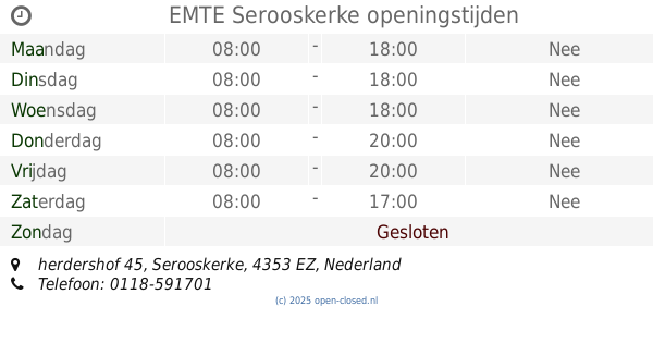 Houd er rekening mee dat de informatie EMTE In Serooskerke, herdershof 45 En alle andere Winkels Het is uitsluitend voor informatieve doeleinden.